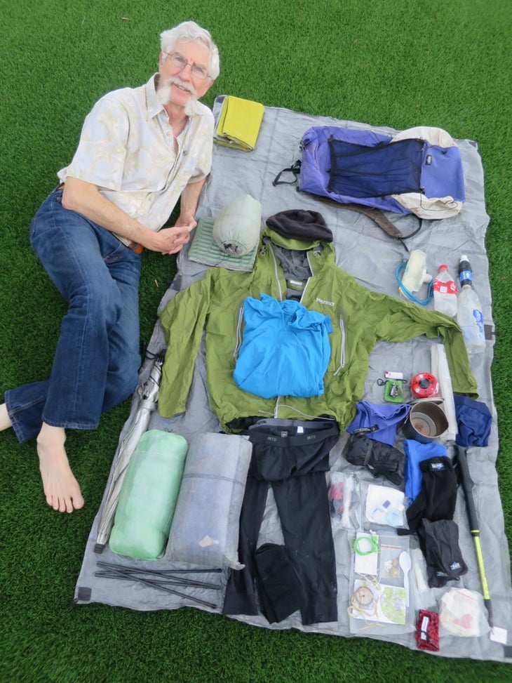 Alternate Gear: Chrome Dome umbrella (7.9); nylon running shorts (2.5); short sleeve shirt (4.5); rain pants (Montane Minumus)(7.0); sleeping bags alternates: Marmot Helium 15-degree (33); and Marmot Atom, 40-degree (17); Sunscreen in small dispenser (1.0,face only); Bearikade bear canister where required.