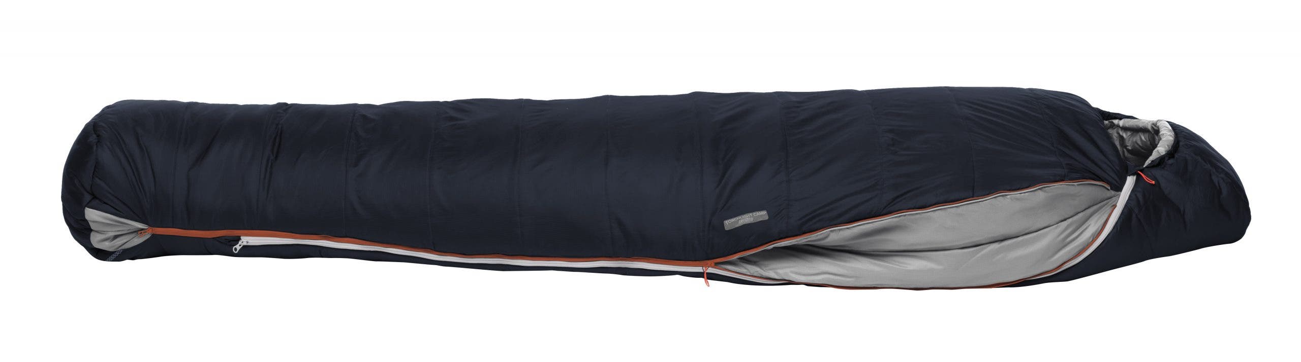 The synthetic Torchlight Camp 35°F is warm, adjustable, and inexpensive, three qualities that should make this bag attractive to a wide range of campers. Its most notable feature solves a problem common to all mummy-shaped bags: While they’re efficient at trapping heat, they can feel tight, especially in moderate temperatures. The Torchlight Camp’s design allows you to adjust the bag’s roominess, a comfort boost any type of sleeper—side or back, restless or calm—will love. Zippers on each side of the bag, separate from the main open/close zipper, “release” more material and expand the bag from a classic mummy shape to a roomier silhouette when they’re unzipped. The zippers offer a full 10 inches of adjustability, increasing the circumferences of the chest and the hips from 60 to 70 inches and 54 to 64 inches, respectively. So, while the Torchlight Camp offers an exceptionally roomy sleep experience, it packs smaller than you’d expect for a bag of this volume. (Due to the synthetic fill it’s still the size of two soccer balls when compressed, though, so is best for car camping or short backcountry overnights. The Torchlight Camp also weighs just under 3 pounds.)