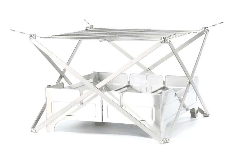 Each piece can be used alone but the beauty of the design comes when using them together. The grill fits perfectly over the firebox and can be lowered or raised with a gentle push. I used kindling and small twigs but don’t let the small box size fool you, the kit can hold more. The accordion grill insert allows for functional set up of kindling or charcoal briquettes. The ferro rod took a little work to ignite, so I would bring thinner scraps of paper next time.