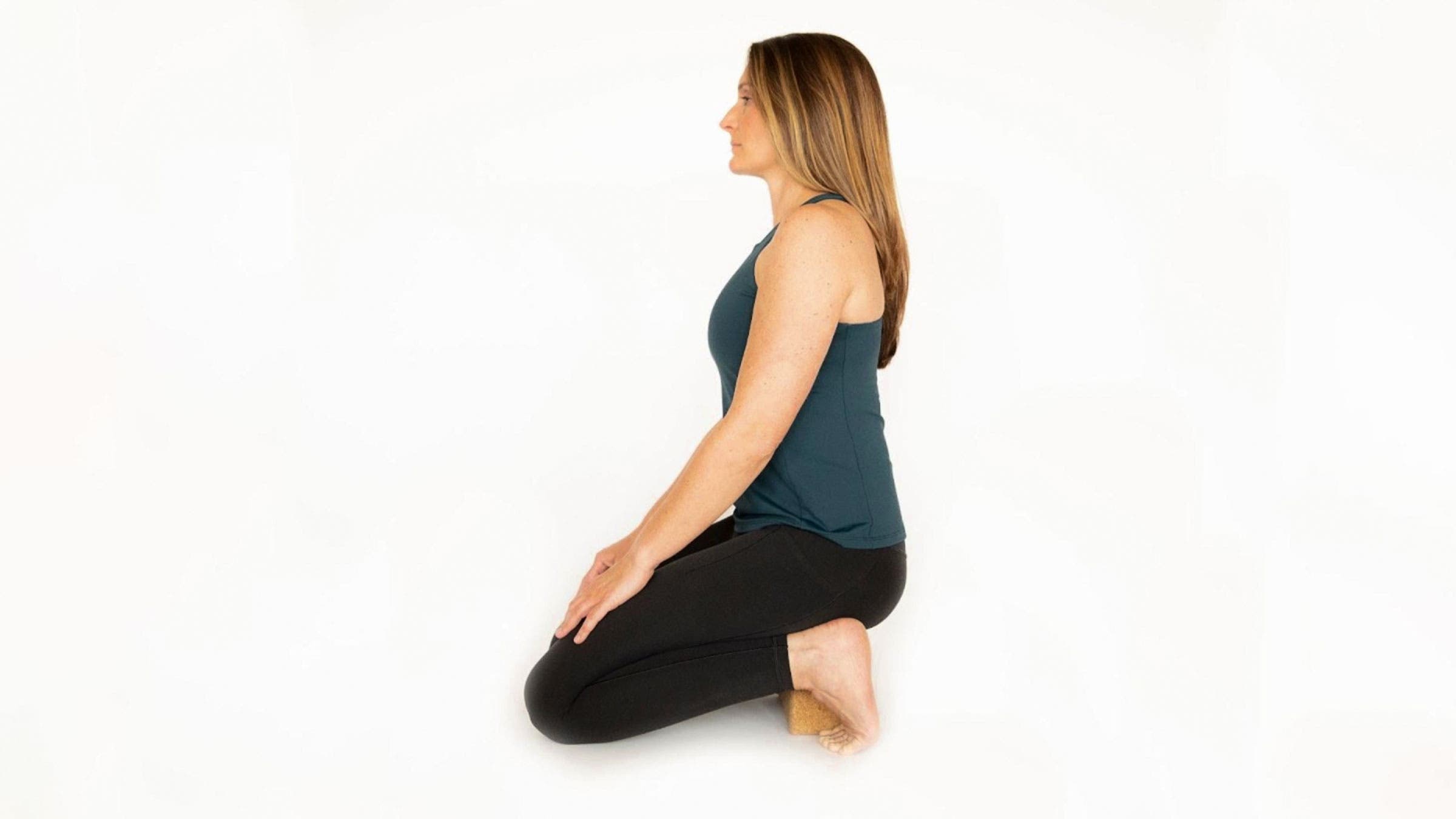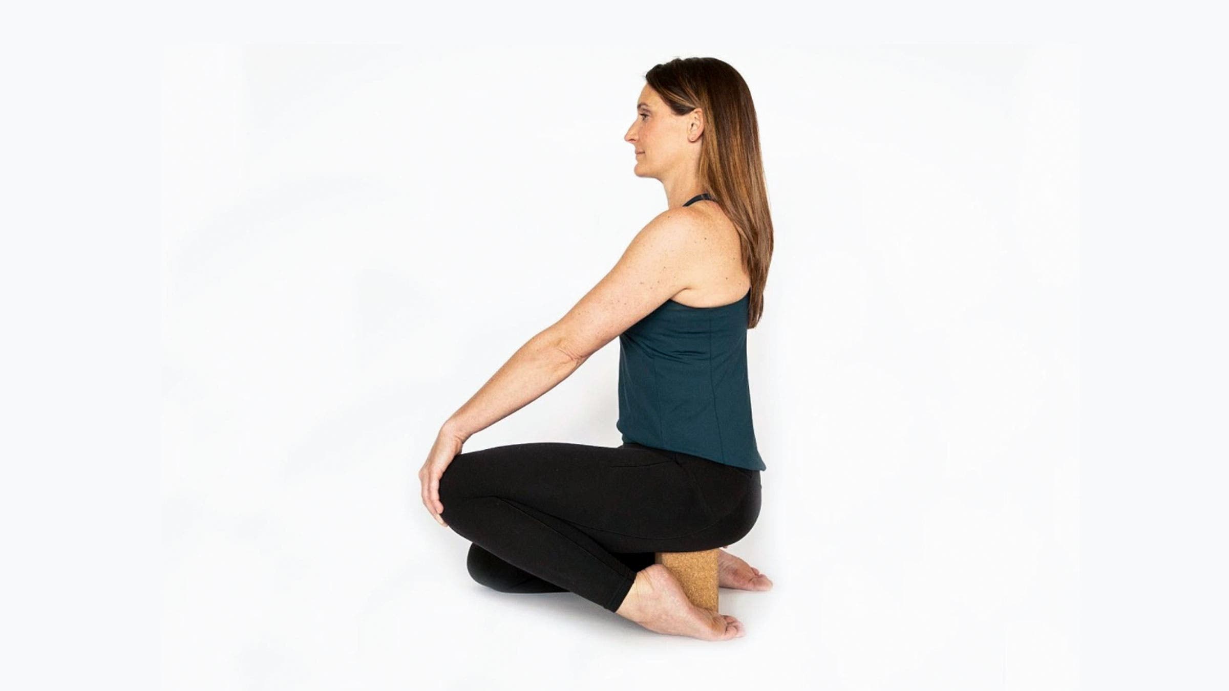 How to: Start seated in Vajrasana (Thunderbolt Pose) with a yoga block between your ankles on the medium height and your toes flexed rather than having the tops of your feet flat on the floor. You might need to manually tuck your smaller toes under. Remain here, seated on the block, hugging your inner heels and big toe knuckles to the block and allow gravity to gently stretch the tissues that connect from the toes through the soles of both your feet. Remain here for 5–8 breaths.