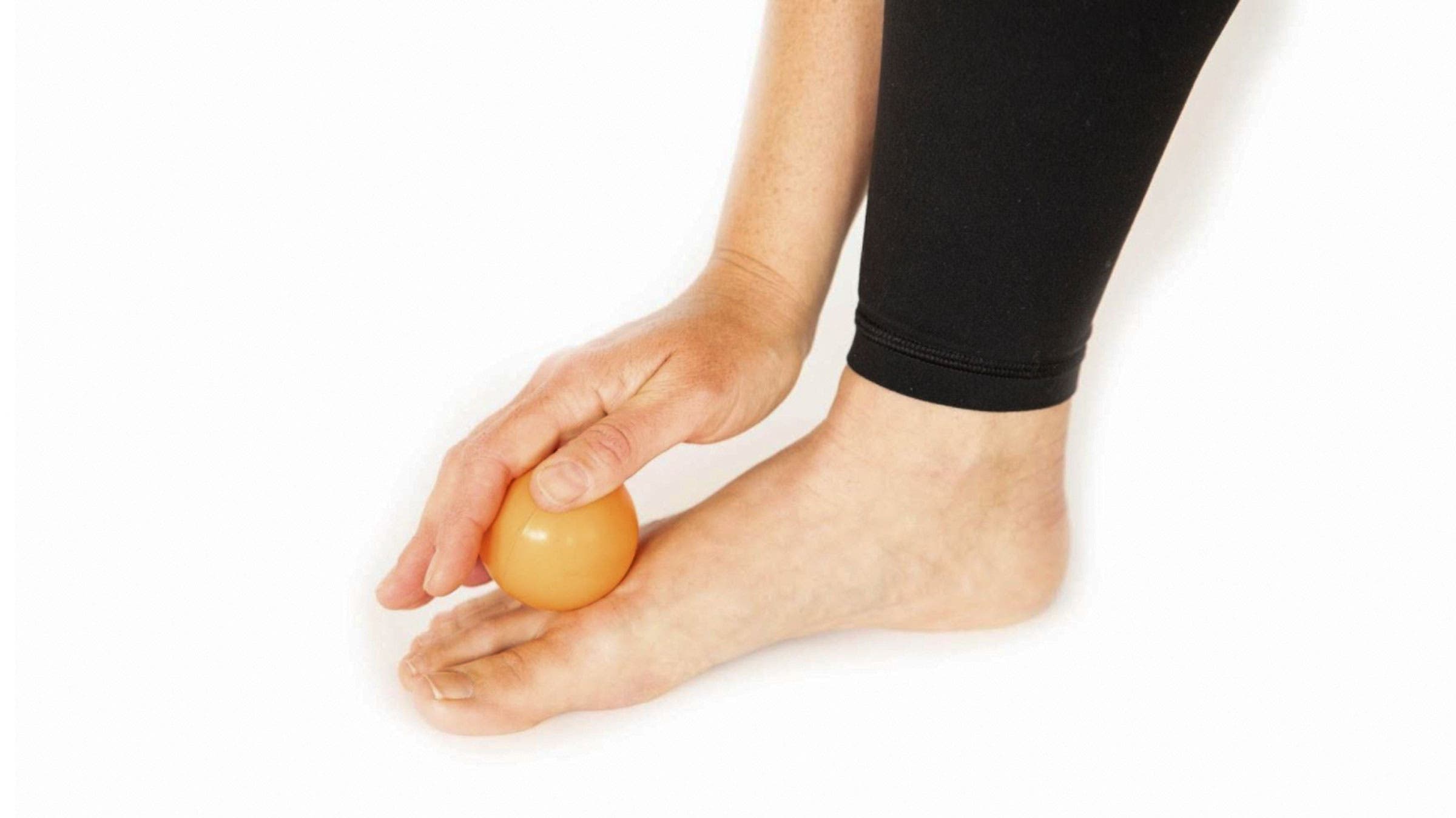 How to: Start standing or seated in a chair with both your feet flat on the floor. Place a small ball or a can of soup under your right foot. Slowly roll it back and forth along your sole as you apply gentle pressure. Start at the heel on the big toe side, then roll up to the big toe knuckle, then back down to the heel, and repeat with each toe. Continue for 2-3 minutes. Switch feet.