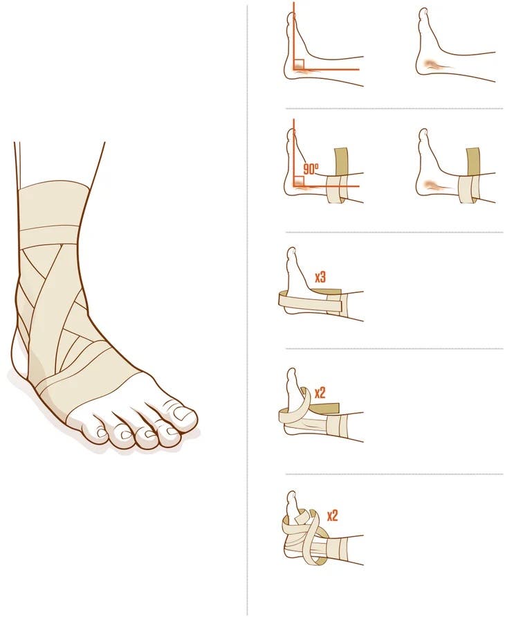 5) Make figure eights by taping down the side of the ankle, across the top of the foot, across the Achilles heel and the other side of the ankle, and back to the arch. Repeat twice.