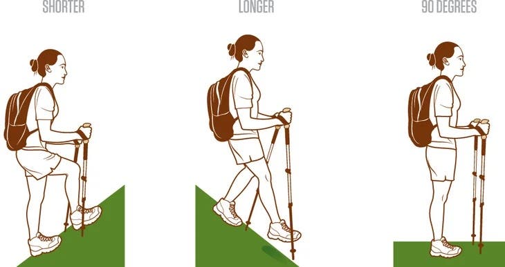 Hiking with poles reduces compression on the knees by up to 25 percent on descents, and poles cut down on muscle strain and the risk of ankle injury. On flat ground, adjust height so your elbows are bent at a 90-degree angle. Shorten poles on uphills and lengthen on the downs. You might be using your trekking poles wrong; check out this guide to be sure.
