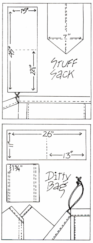 A good first project is the ditty bag, a relatively small drawstring sack of lightweight nylon which separates items within a pack. It’s good for keeping small items together, protecting down gear, isolating dirty clothes, or segregating food rations by the meal or day. Much stronger than a plastic bag, the ditty bag weighs very little. It can be made of uncoated fabric, but waterproof ripstop or taffeta is best for general use. The bag can be labeled with an indelible felt marker.