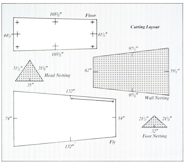 The floor fabric can be any weight from 1.9 to 3.5 ounces per square yard, depending on your preference for light weight over durability. If it’s available, the fly can be made of 1.5-ounce coated ripstop, since it is not subject to as much wear and tear. Otherwise, 1.9-ounce ripstop is fine.