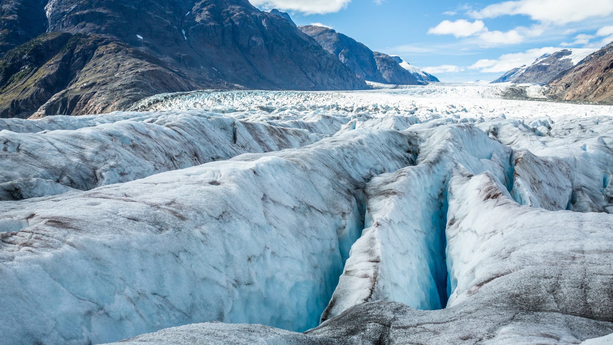 If a glacier is flowing quickly enough (it’s thick and heavy, or moving down a particularly steep slope), crevasses can form where sections of ice stretch apart because the ice lower down is moving faster than the ice above it. Once a crack appears, the motion and weight of the glacier act together to pull these starter fissures into gaping chasms.