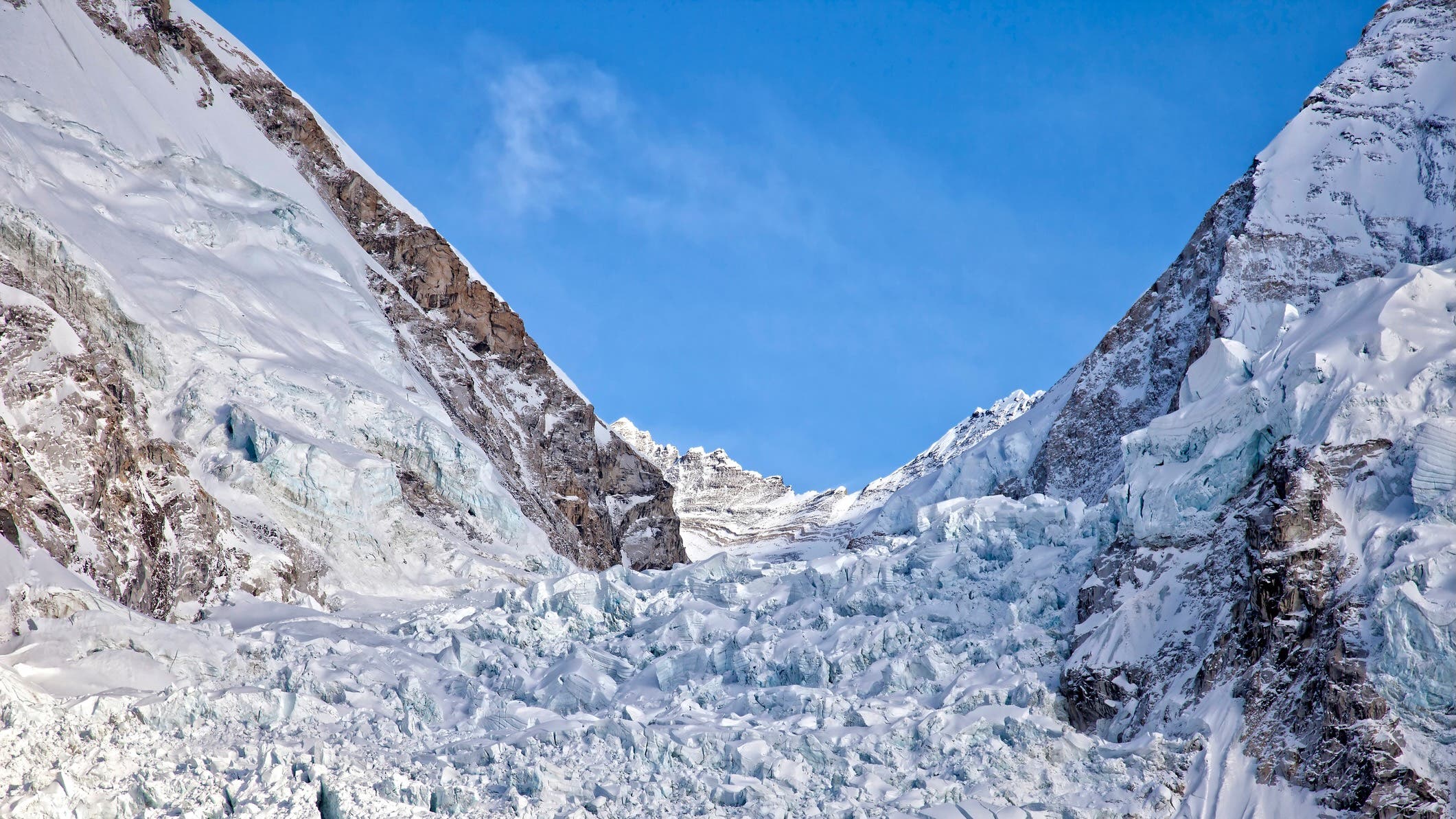Dramatic jumbles of crevassed ice that resemble frozen waterfalls often form where small, higher-elevation tributary glaciers flow into larger ice masses below (just as small streams feed into larger ones). At those junctures, the steep step between the tributary and the main glacier leads to high stress on the ice, creating a crevassed drop-off like Mt. Everest’s infamous Khumbu Icefall or Yosemite’s once-frozen Bridal Veil Falls.