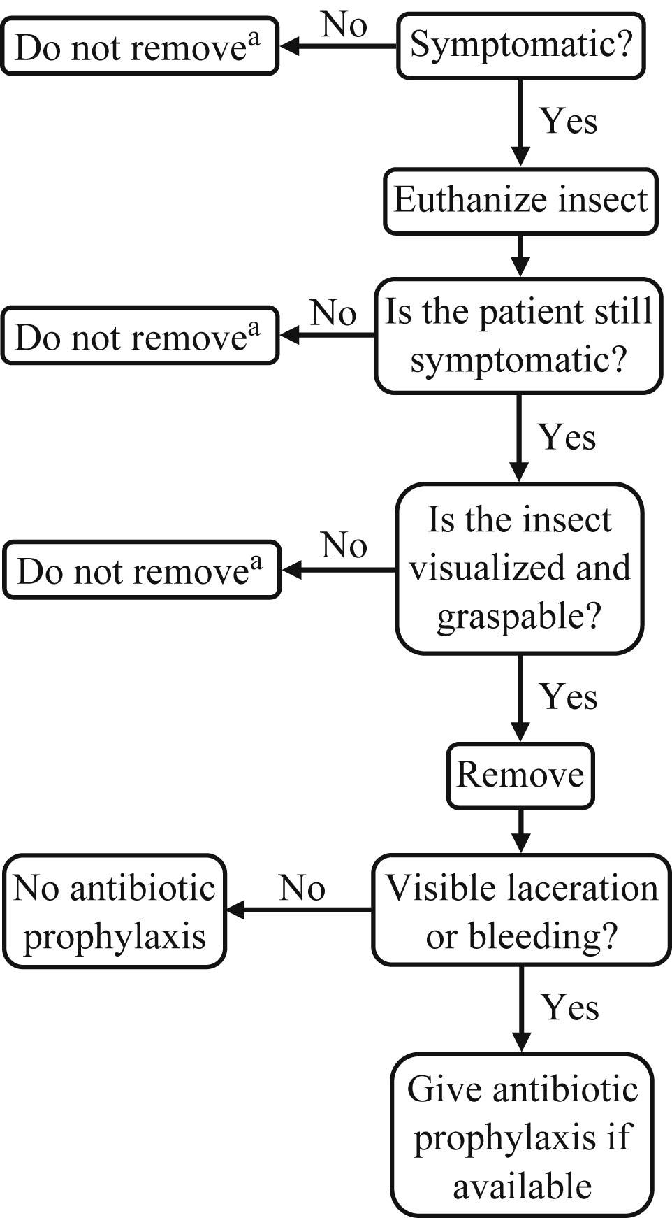 Dealing with bugs in the ear is more challenging in the backcountry, because you don’t usually have specialized equipment with you and there’s a significant danger of damaging the delicate structures of the ear. With that in mind, here’s the decision tree they provide for bug removal in the wilderness: