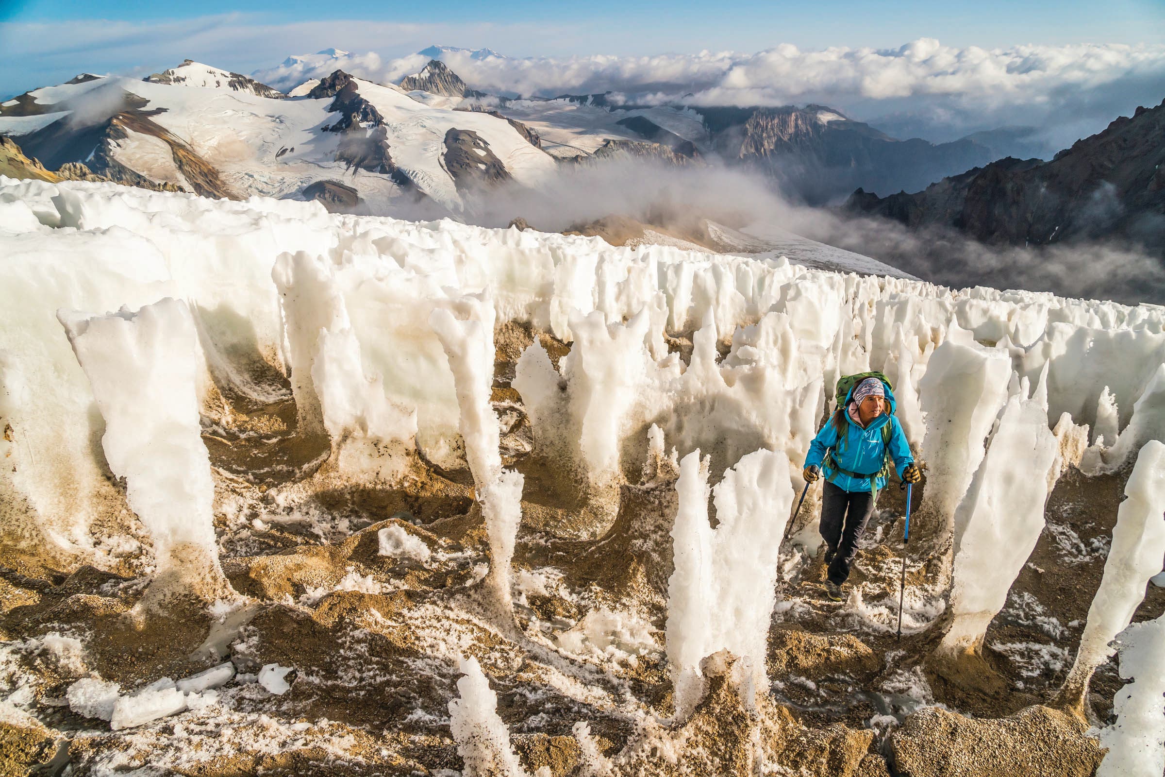 Gilbert hikes through penitentes (thin blades of hardened snow) below Camp 3
