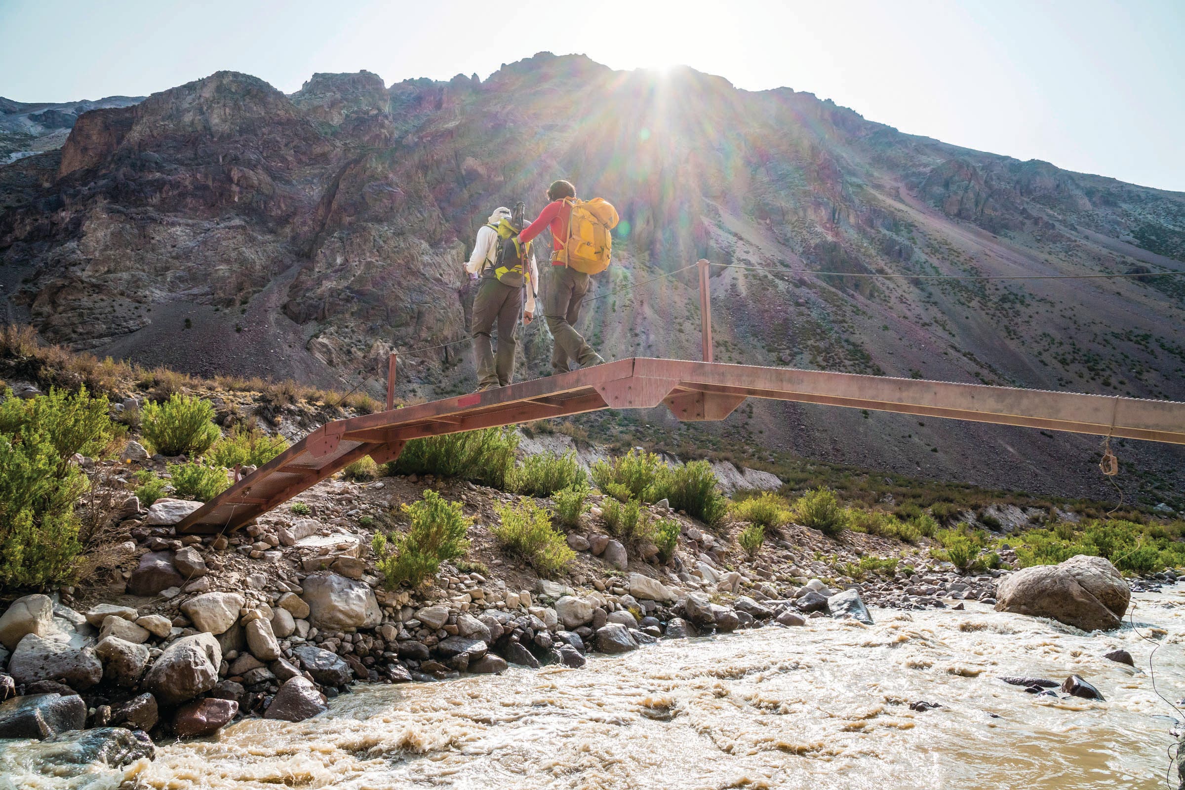 Penney and Baskis cross the Vacas River on the way to basecamp