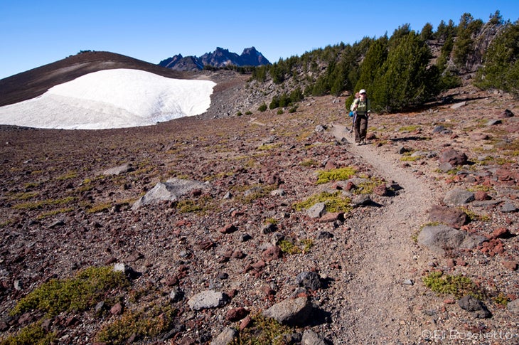 Back at the junction, turn south toward the 7,000-foot pass between South Sister and Broken Top. Continue on trail to descend a moraine into the Green Lakes Basin.