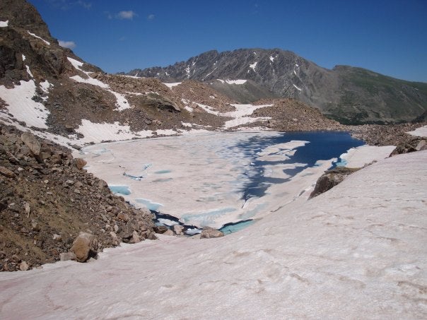Ice shrouds this high-country lake, nestled beneath the southeast face of Mount Neva, deep into summer.
