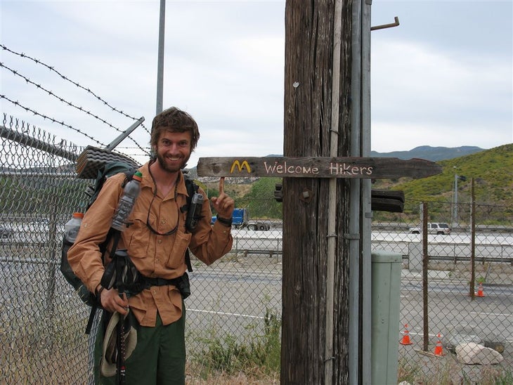 Our intrepid contributor stands at a trail sign to the only McDonald’s near the PCT. ©Jack Haskel