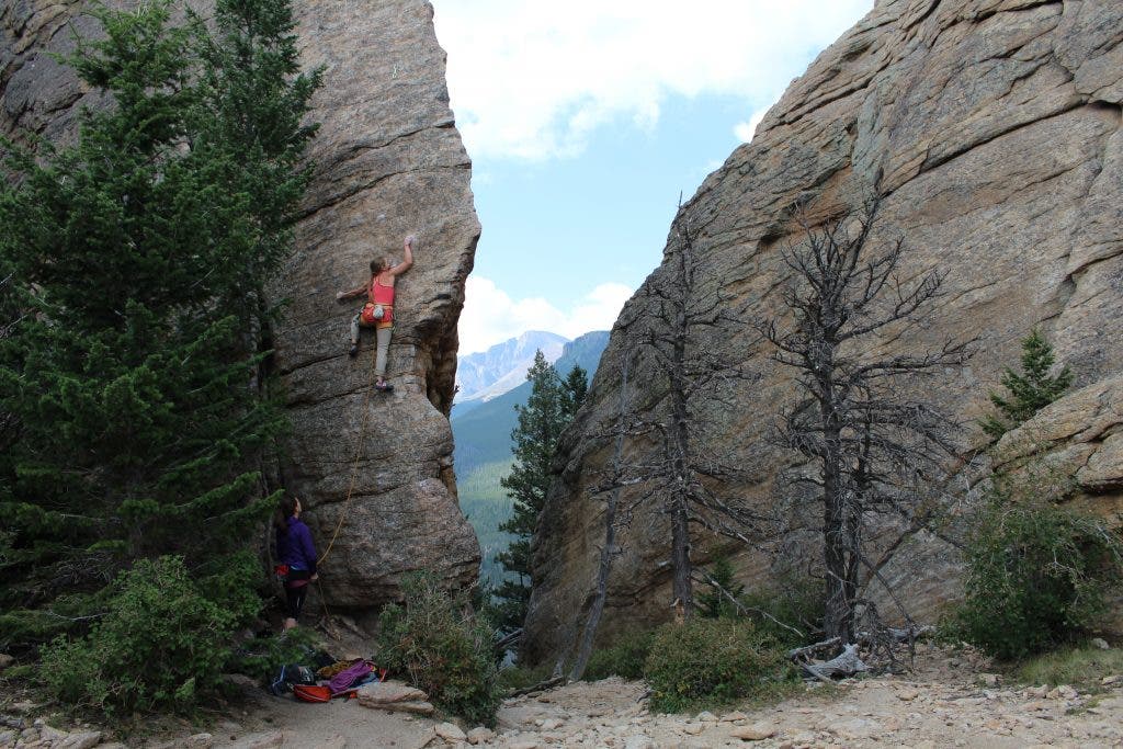Tucked between Lily Lake and the Lily Mountain, Jurassic Park is a hidden rock garden that’s just as much a worthwhile hiking destination as it is a premier spot for Estes Park sport climbing. For most, there’s a trail heading off the north side of Lily Lake (for our dogs, a separate climbers path avoids the National Park boundary by climbing from Route 7—be sure to study the maps to know where the park boundary begins). You’ll know you’re there when tall rock fins rise up on nearly all sides from the small valley floor. Look for “Edge of Time,” an impressive rock fin with a classic 5.9+ rock climb along it’s edge.